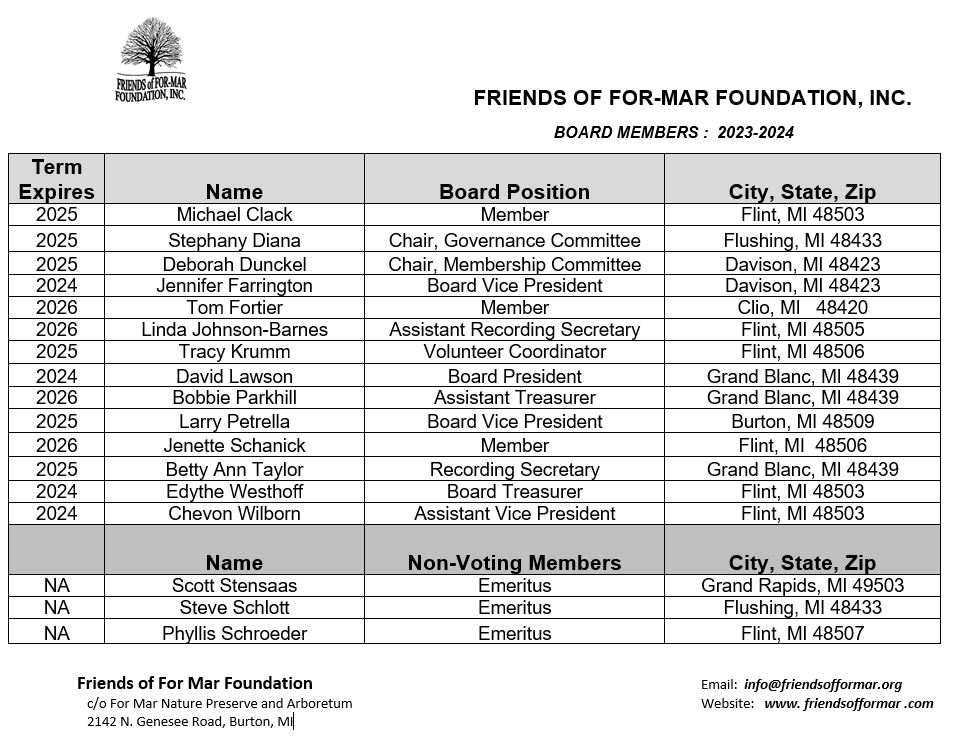 The 2023 Annual Meeting was held on Wednesday, May 24, 2023, beginning at 3 PM, in the Visitors’ Center, 2142 N. Genesee Road, Burton, Michigan. All Members of the Foundation are welcome and encouraged to attend the Annual Meeting, held on the last Wednesday each May. Watch this page for the meeting notice of May 2024.